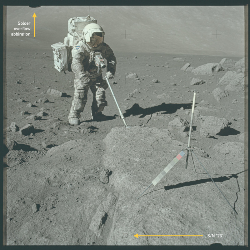 Every lunar camera has a unique serial number, usually etched into a piece of glass that’s pressed against the film plane. It’s known as the Réseau plate, used to help scientists both accurately measure objects in view, and identify what camera took what image. By simply looking through the photos captured on Apollo 17, we know Cernan’s CDR camera was S/N 1023, and Schmitt’s LMP camera was S/N 1032.