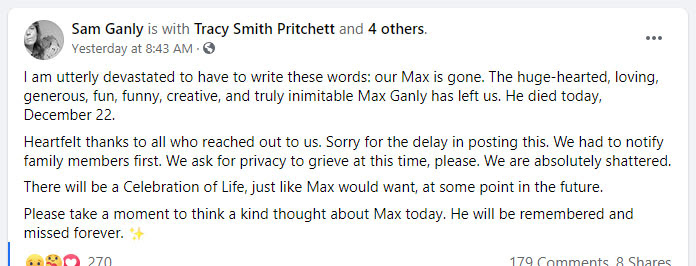 I did not know Max Ganly, but I was aware of his stellar reputation as a photographer. He ended his life today after posting a suicide note on FB. Reach out to your family and friends–hold them close. https://t.co/eHrMcQxAXn #SuicidePrevention #SuicideAwareness #BeKind